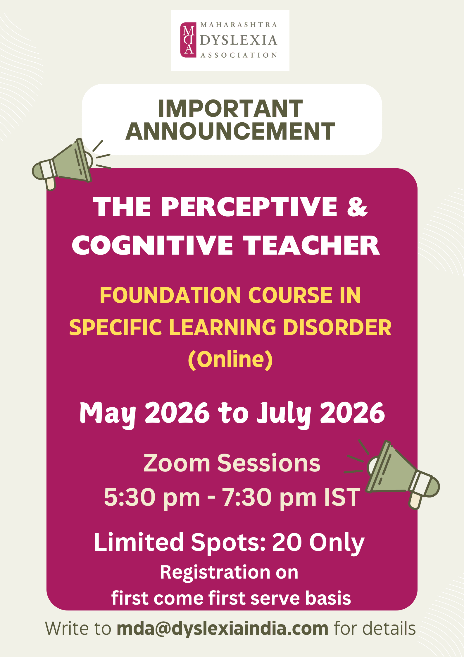 Registration for 'The Perceptive & Cognitive Teacher' - MDA's COVETED one of a kind modular ONLINE Foundation Course in Specific Learning Disorder is now open.